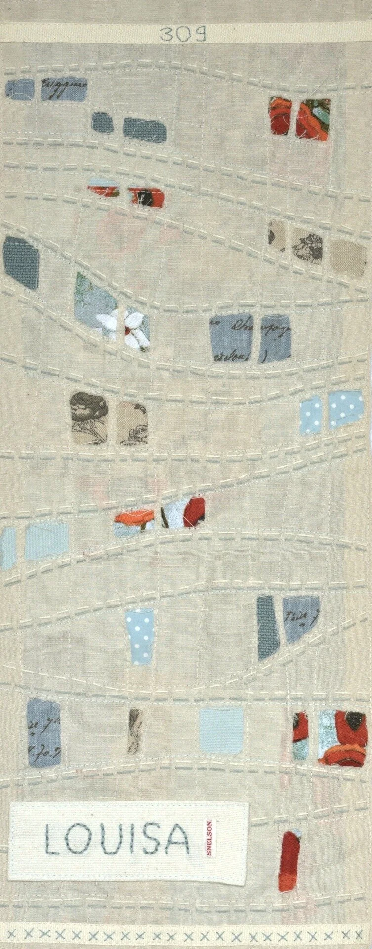 Panel materials: Cottons/linens I already had. The overall look is of a stained glass window with images of letters and flowers. I’ve used an old school name tape for her surname; I also stitched inside the names of all the Snelson women in my family.